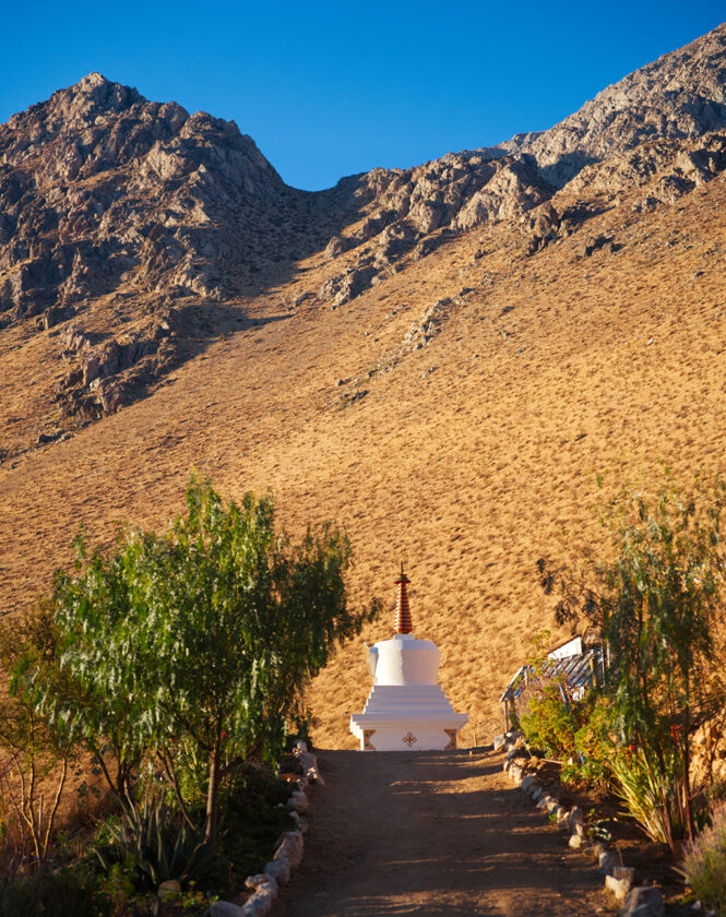 La caminata hacia la Estupa es sencilla y encantadora. Puedes realizarla a pie, disfrutando de la luz y los colores del valle, o llevar tu cámara para fotografiar la belleza natural que te acompaña durante el trayecto. Es un paseo que recomendamos hacer sin prisa, sintiendo la energía del lugar y del entorno.